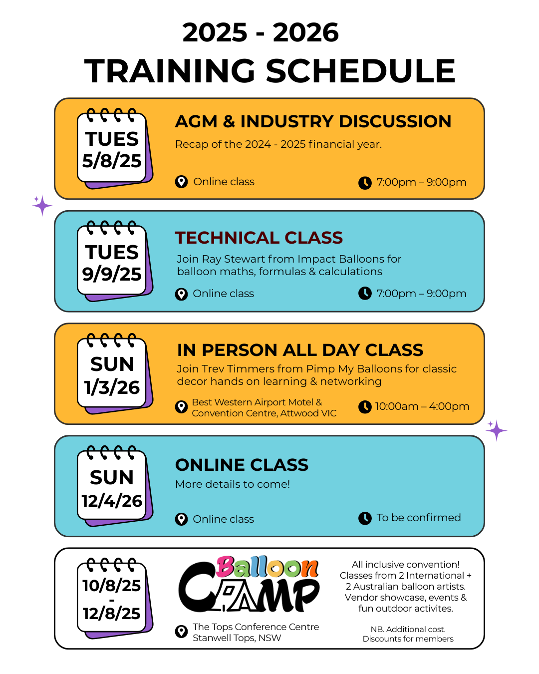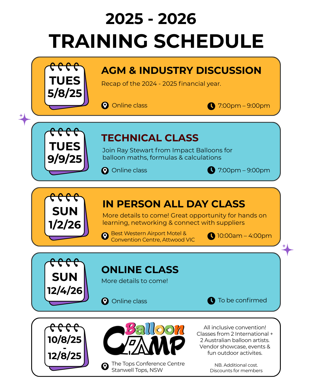 Australian Balloon Association hold a range of training sessions throughout the year & provide an annual Training Calendar, giving you ample opportunity to plan.